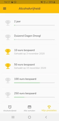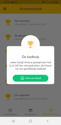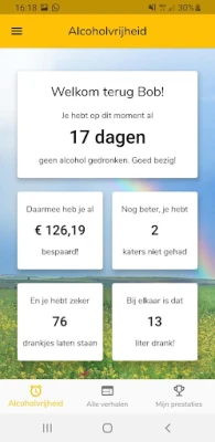 In deze 100% gratis app vind je mooie ervaringsverhalen, tips en leuke statistiekjes over jouw eigen reis naar alcoholvrijheid. Zo weet je hoe lang je al gestopt bent, hoeveel geld je hebt bespaard, hoeveel drankjes je hebt laten staan, hoeveel liters dat zijn en zelfs hoeveel katers je bespaard zijn gebleven sinds je bent gestopt. Hoe leuk is dat?