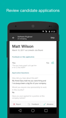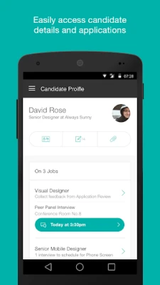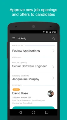 • Easily approve new job openings and offers • Review candidate applications • Access Interview Kits and provide interview feedback • Search for and view candidate profiles • View a task dashboard of upcoming interviews, scorecards due, applications to review and pending approvals