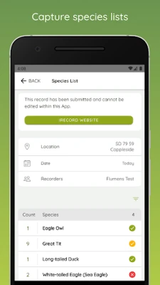 • Works fully offline • Record all the wildlife you see - supports all UK species • Add new records with minimal effort • Benefit from automatic data checks and review by experts • Share your sightings with the recording community • Contribute to science and conservation